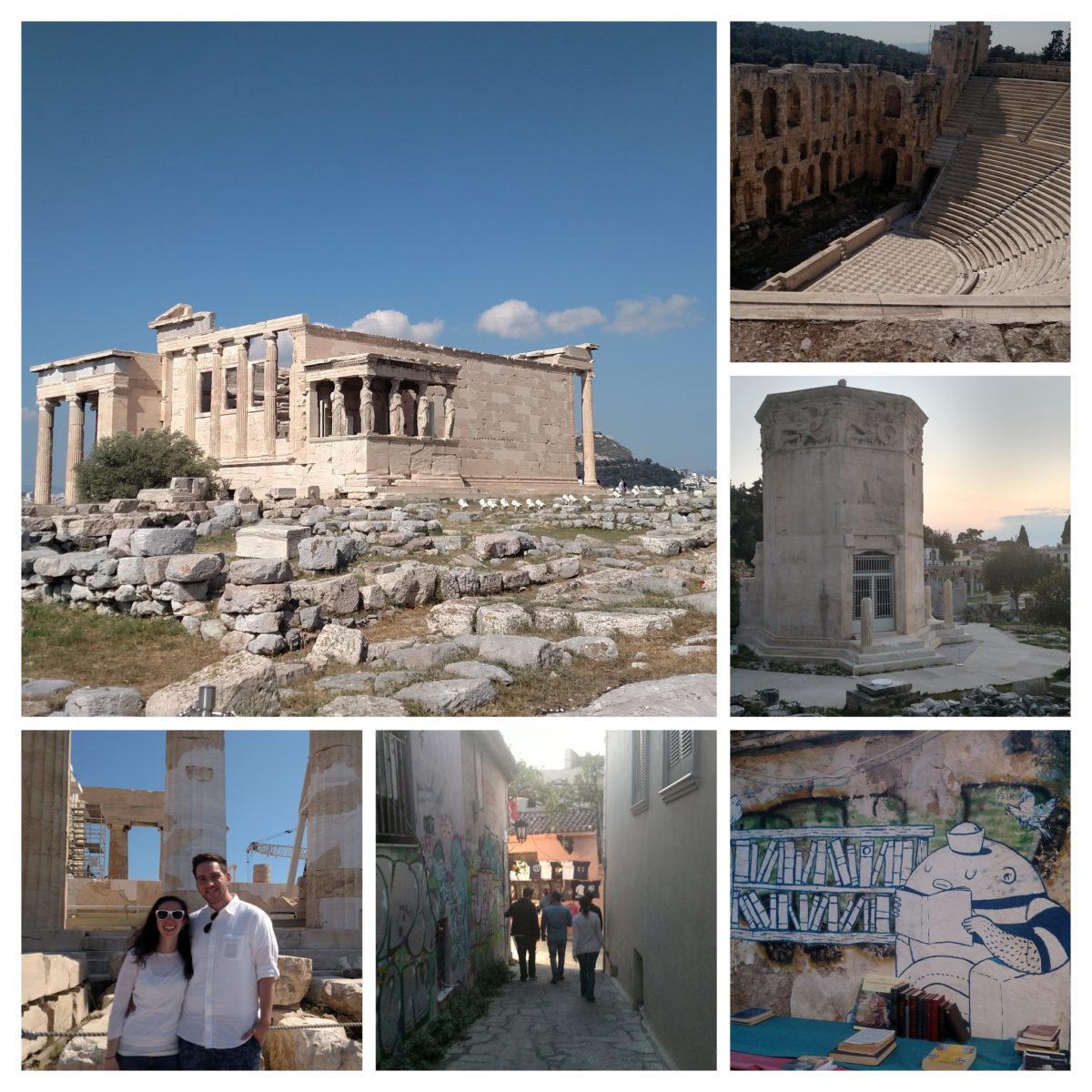 Top Left: Acropolis ruins. Bottom Left 1: Two cuties, Rachel and Milton! Bottom Left 2: Our crew walking through Athens. Top Right: Odeon of Herodes Atticus. Middle Right: Ruins…. Bottom Right: Bookstore street art.