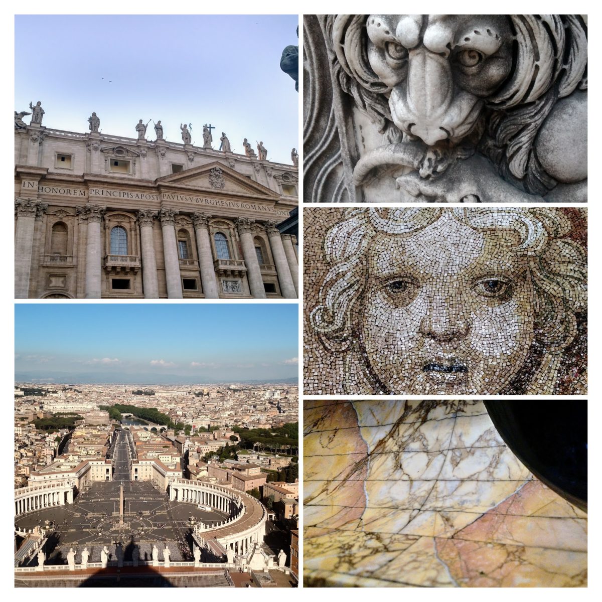 Top left: Vatican. Bottom Left: view from the top of the Basilica. Top Right: Lion eating a goat statue. Middle Right: stoned angel. Bottom Right: Marble, the most beautiful I’ve ever seen was in the Vatican.
