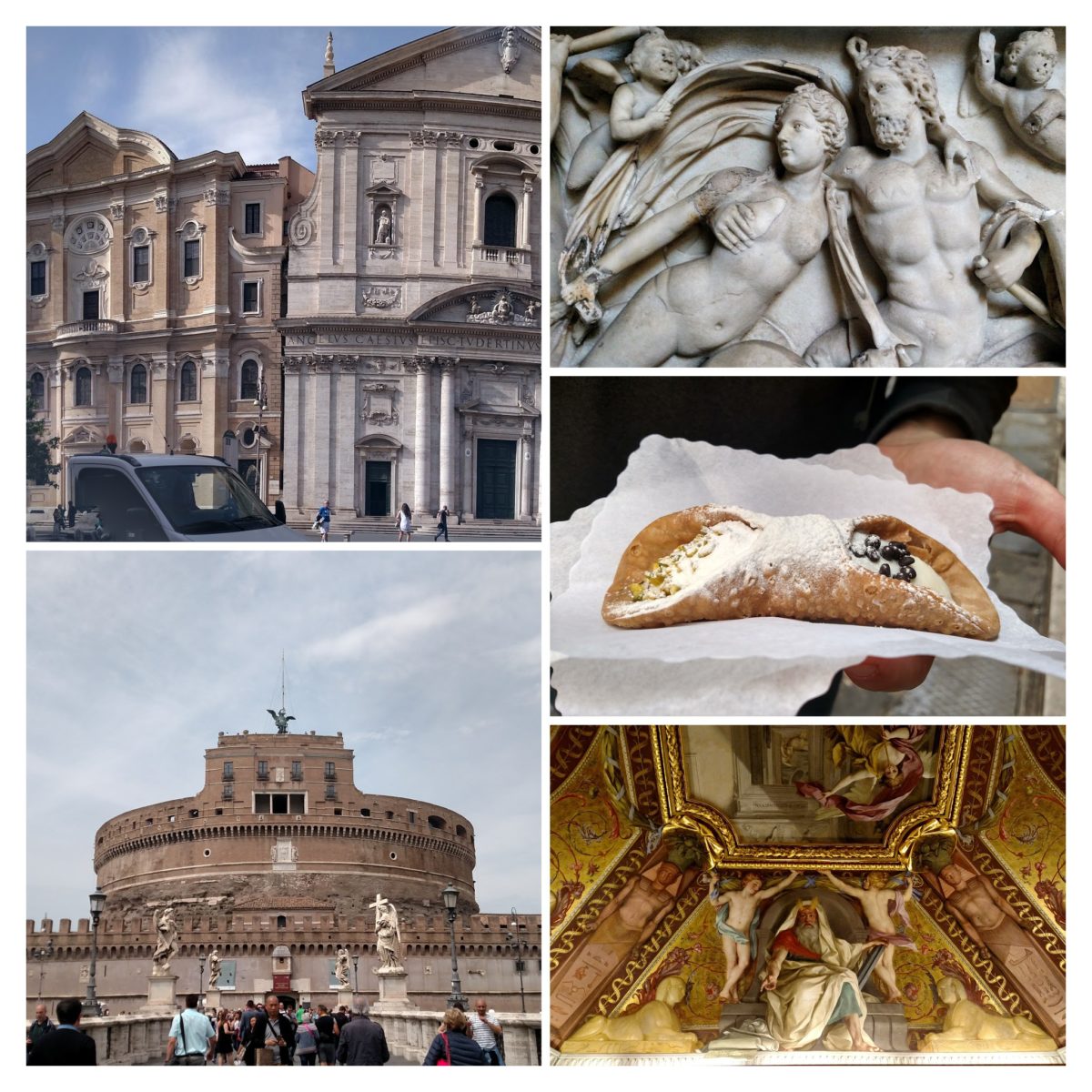 Top Left: these buildings aren’t really leaning, but camera shot looked cool. Bottom Left: Vatican. Top Right: Hey now! Vatican Museum art. Middle Right: Cannoli from a small bakery. Bottom Right: Inside the Vatican Museum again.